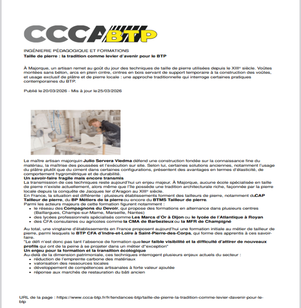 À la croisée de la tradition et des enjeux actuels du BTP, la taille de pierre suscite un intérêt renouvelé. Matériau durable, valorisation des ressources locales et transmission de gestes techniques : ce métier d’excellence répond pleinement aux défis de la transition écologique.