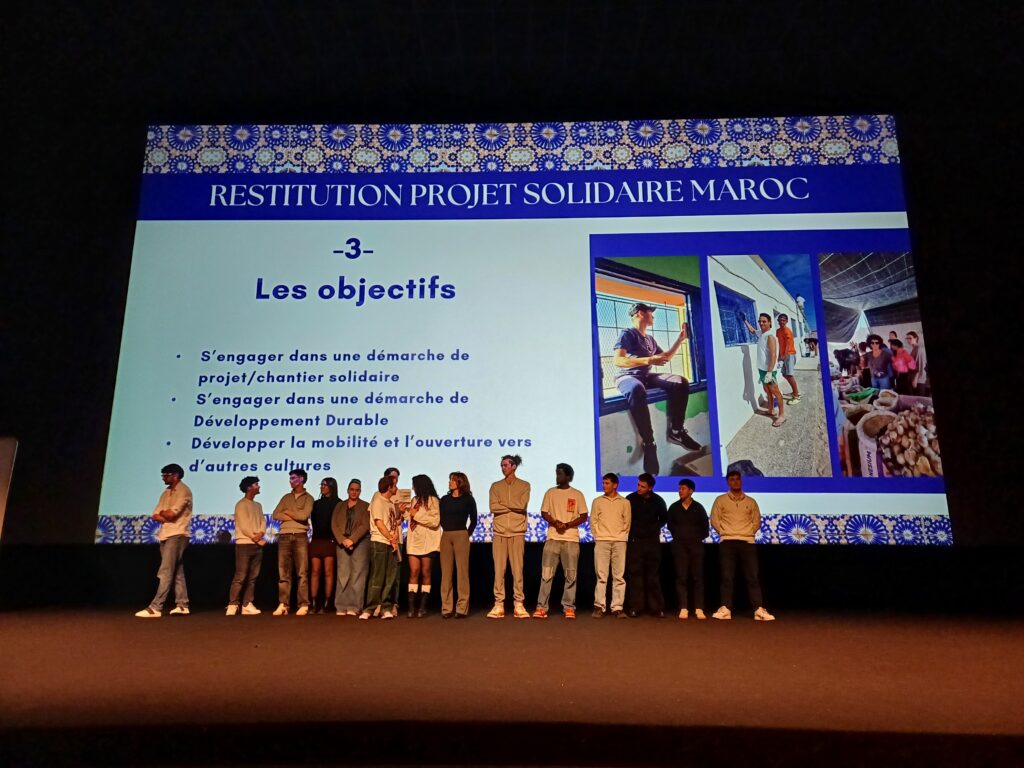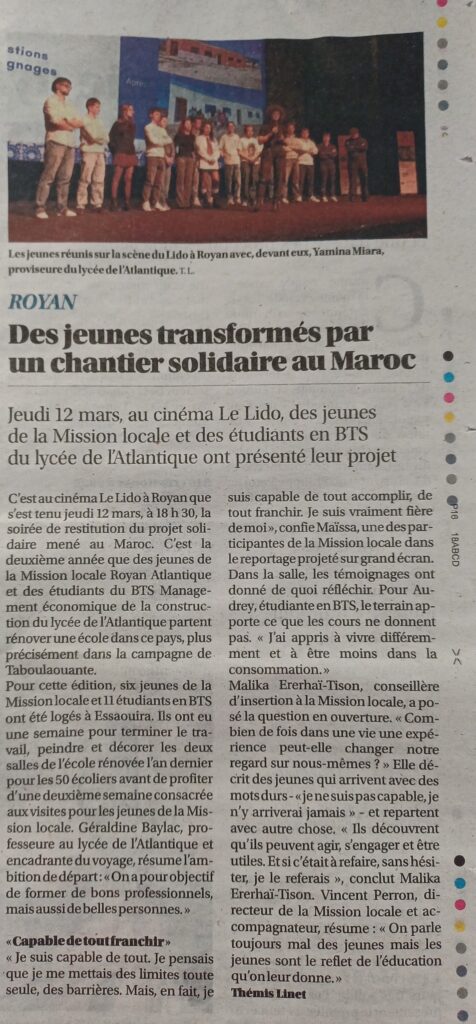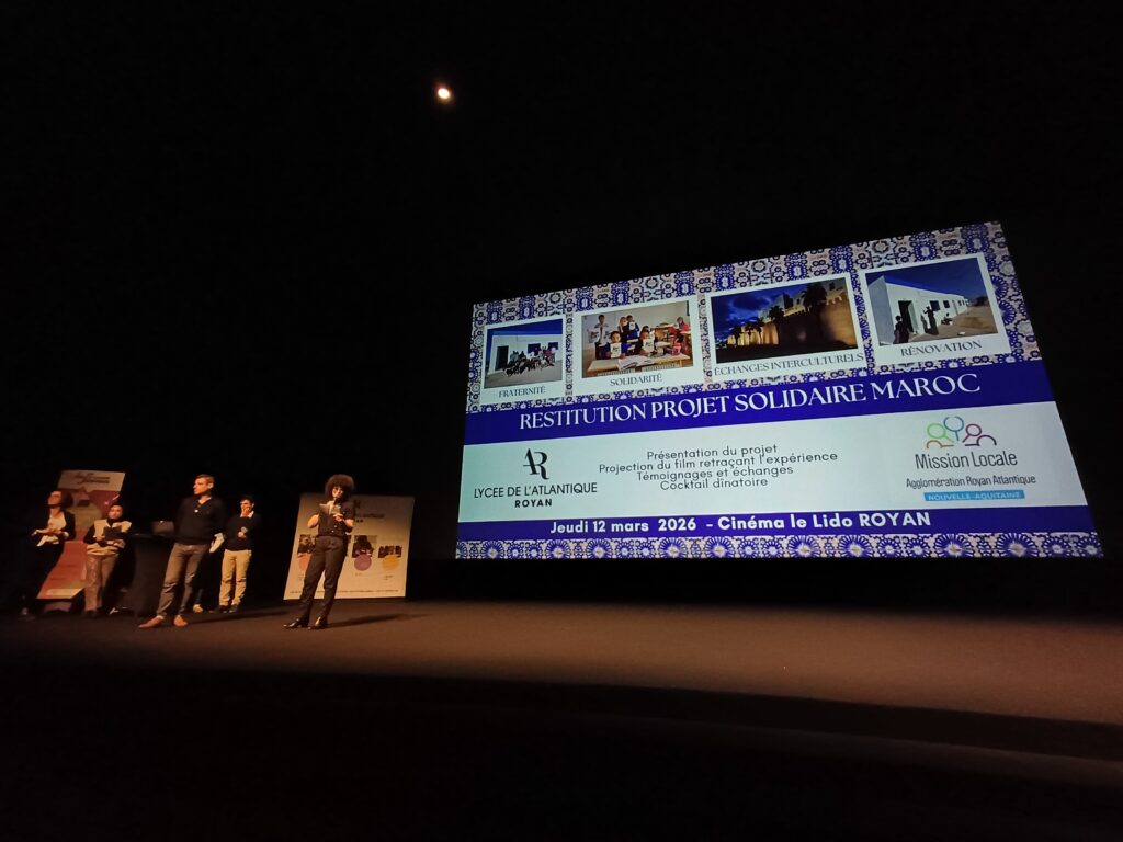 Jeudi 12 mars, le cinéma Le Lido à Royan a accueilli la soirée de restitution du projet solidaire mené au Maroc par les étudiants de BTS Maintenance des Équipements (MEC), en partenariat avec des jeunes de la Mission Locale.